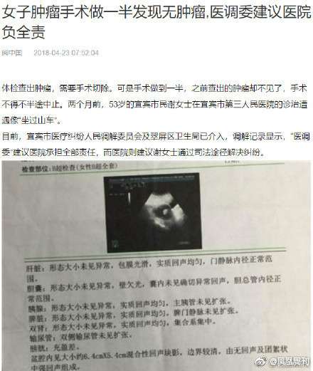 手术做一半发现无肿瘤 医调委建议医院负全责