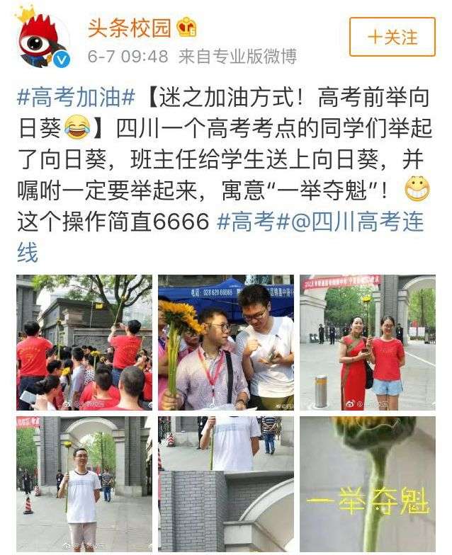 一大早,这样一条新闻就上了热搜:四川一班主任给高考的学生们送上了向日葵,并嘱咐一定要举起来,寓意“一举夺魁”。