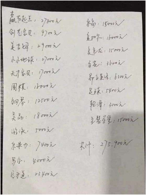 “赢在起点”早教班27800元,“美吉姆”早教班29000元,“小小地球”少儿英语27000元,“至慧学堂”数学思维班15000元……每个0都很扎心。