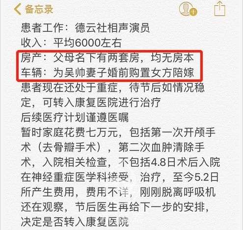 据了解,吴鹤臣家在北京有两套房,自己还有车。前期治疗基本结束,费用才7万元,怎么就要向网友筹100万了?随后吴鹤臣母亲补充了情况说明: