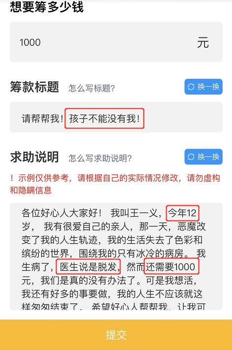 筹款金额最低1000元,上限是100万元。如果用户写不出如笔者这样感人肺腑的文案,平台还可以帮你直接生成。